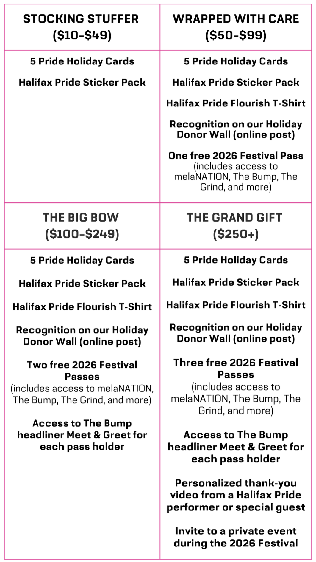 This November and December, Halifax Pride invites you to take part in our Season of Giving Campaign. Your support fuels: