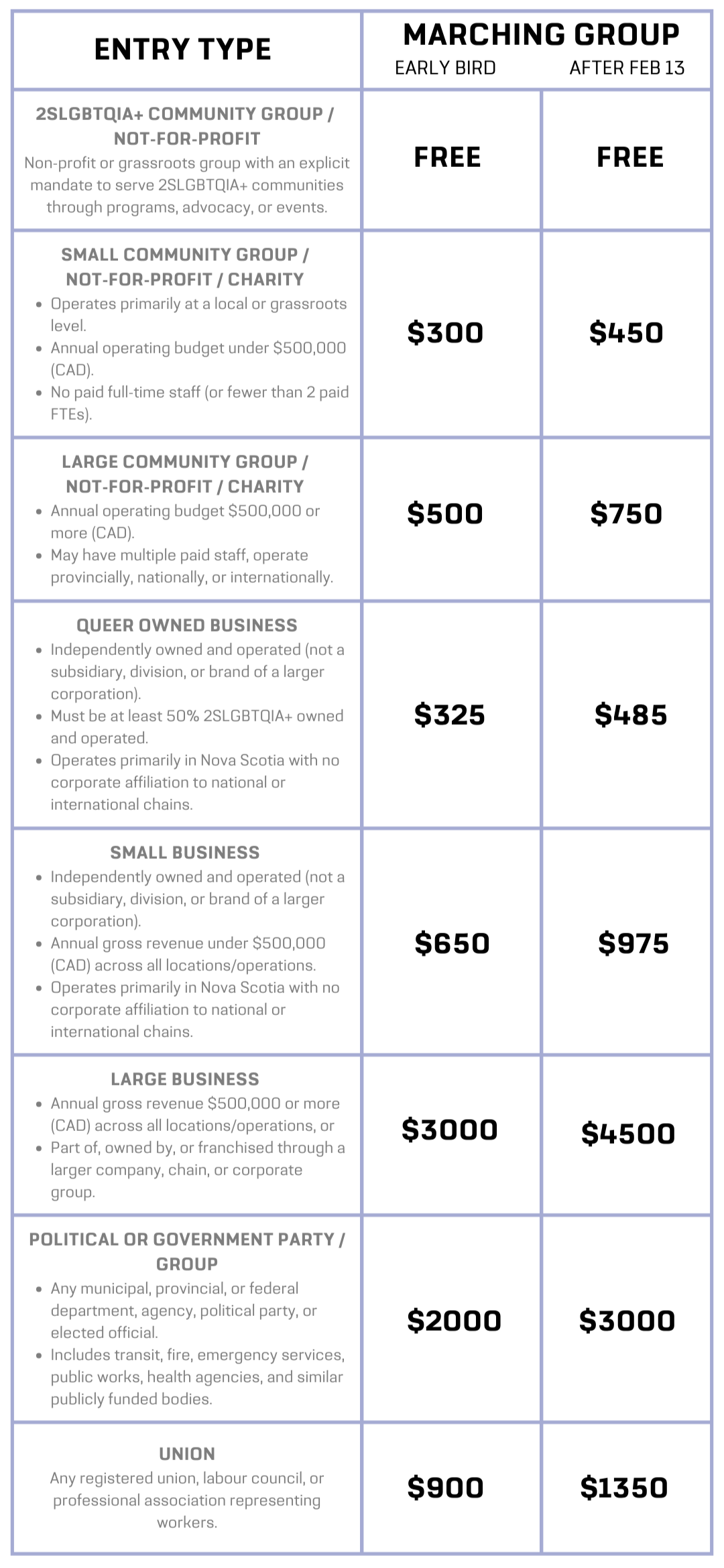 If you are unsure of which category you fall under, or have any questions about pricing, please email parade@halifaxpride.com.